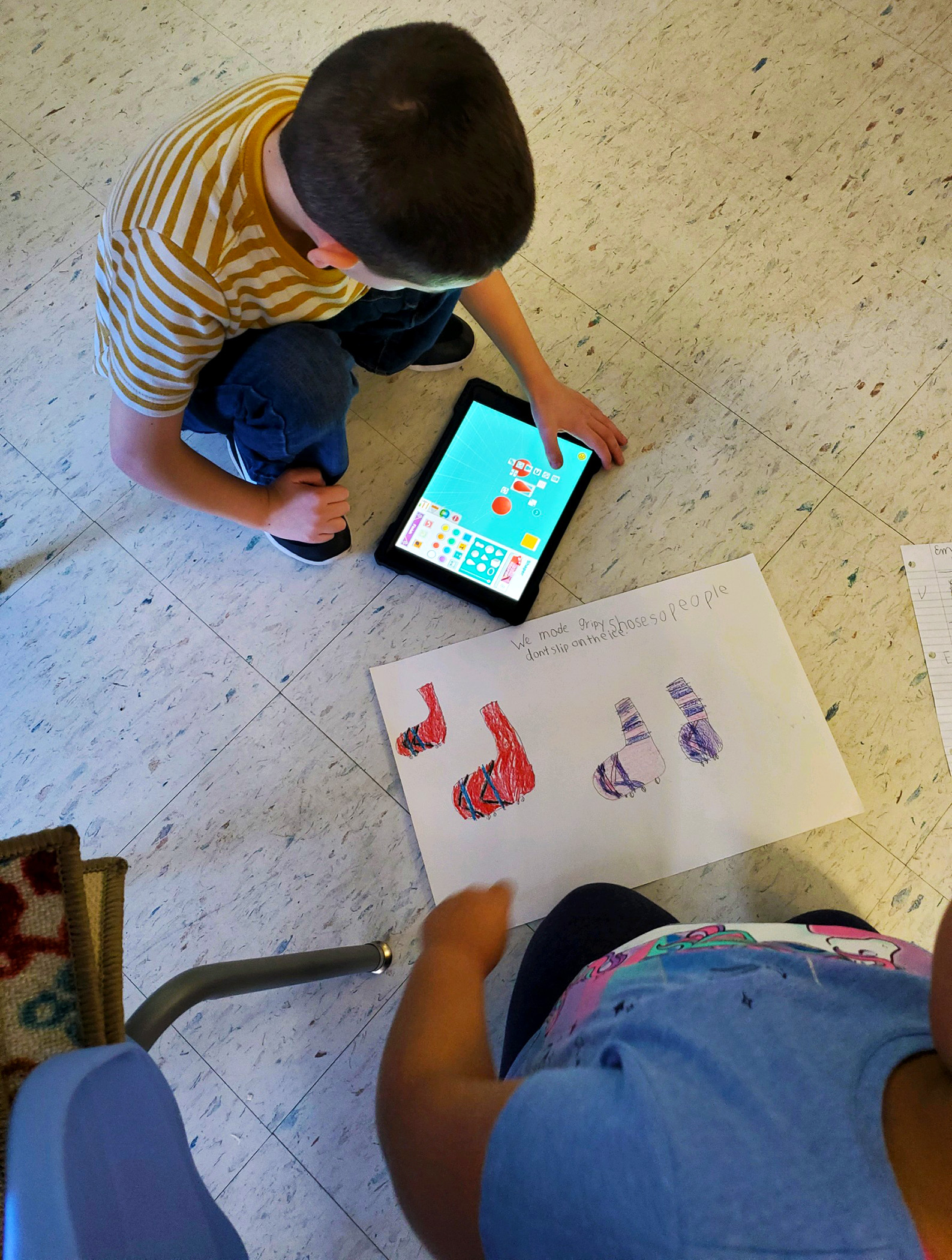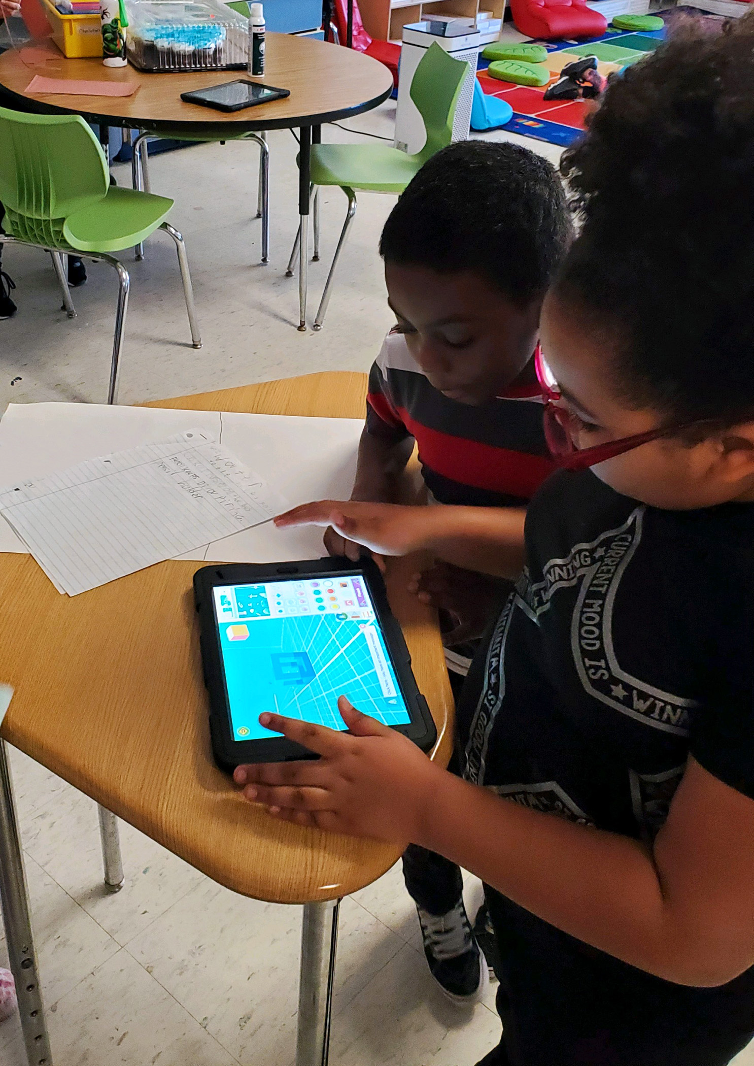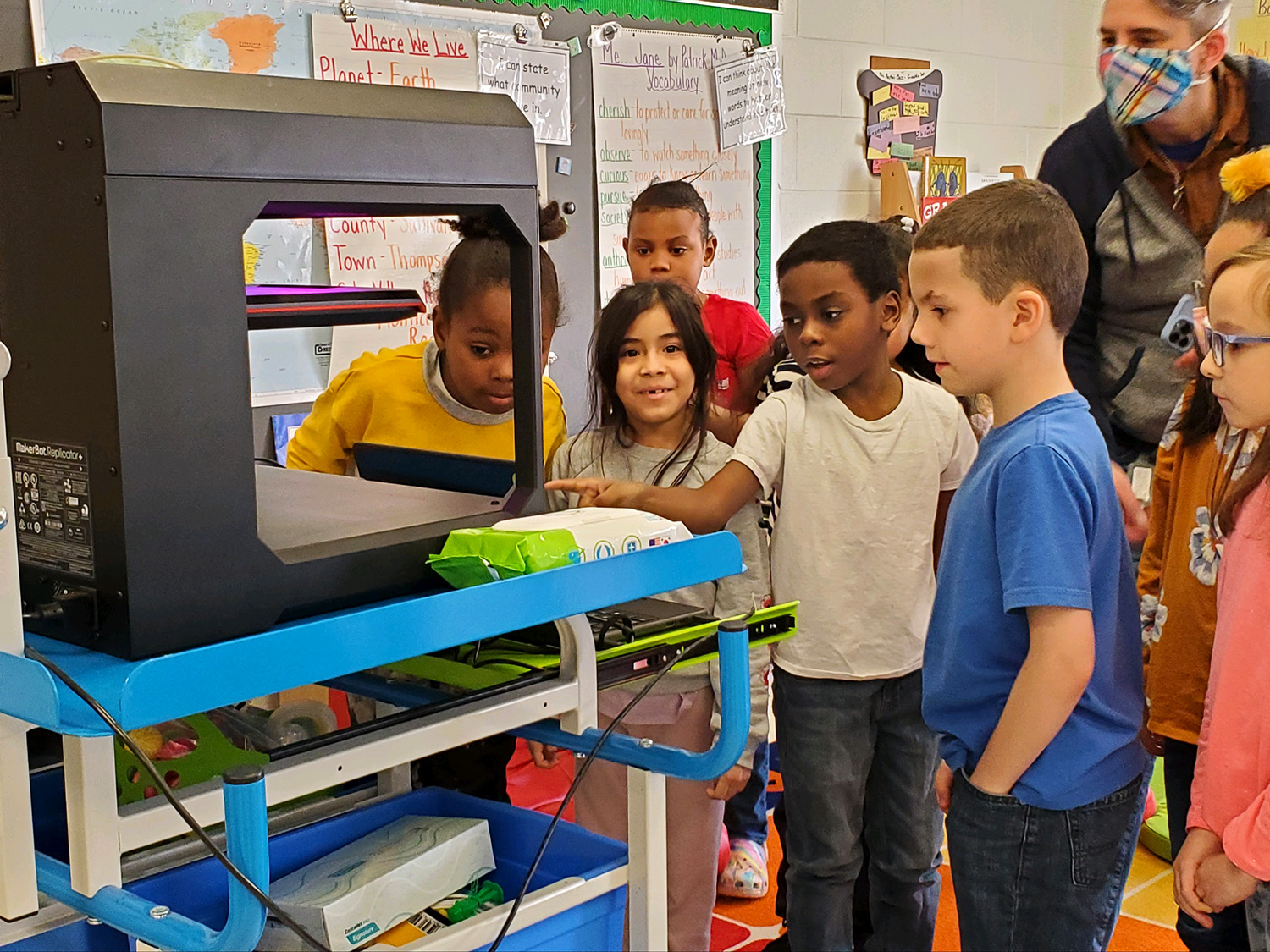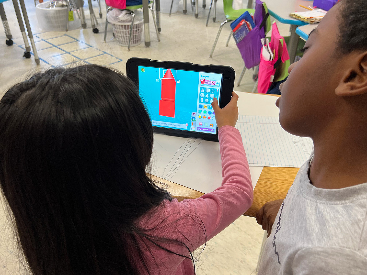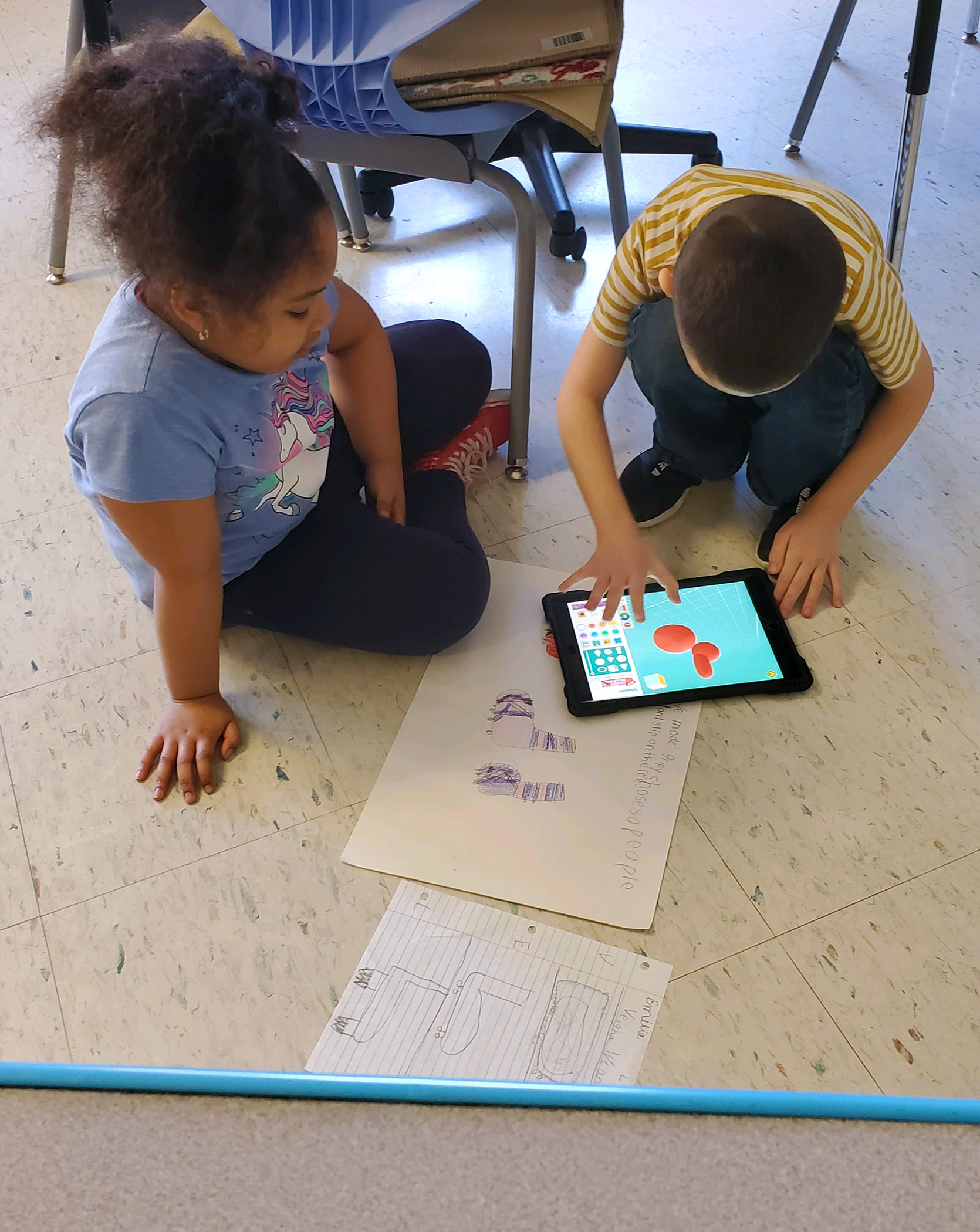 There are some engineers in the making at Cooke Elementary! Students in Mrs. Ruston’s 2nd grade class read about Rosie the Riveter and then became engineers themselves, working in groups to solve a world problem. Students decided to create cup holders that make cups less loud when they hit the floor, as well as grippy shoes that prevent individuals from slipping on ice. Students first drew scales out on paper and then used their iPads to design 3D models of their cup holders and grippy shoes using “Makers Empire the App”.
