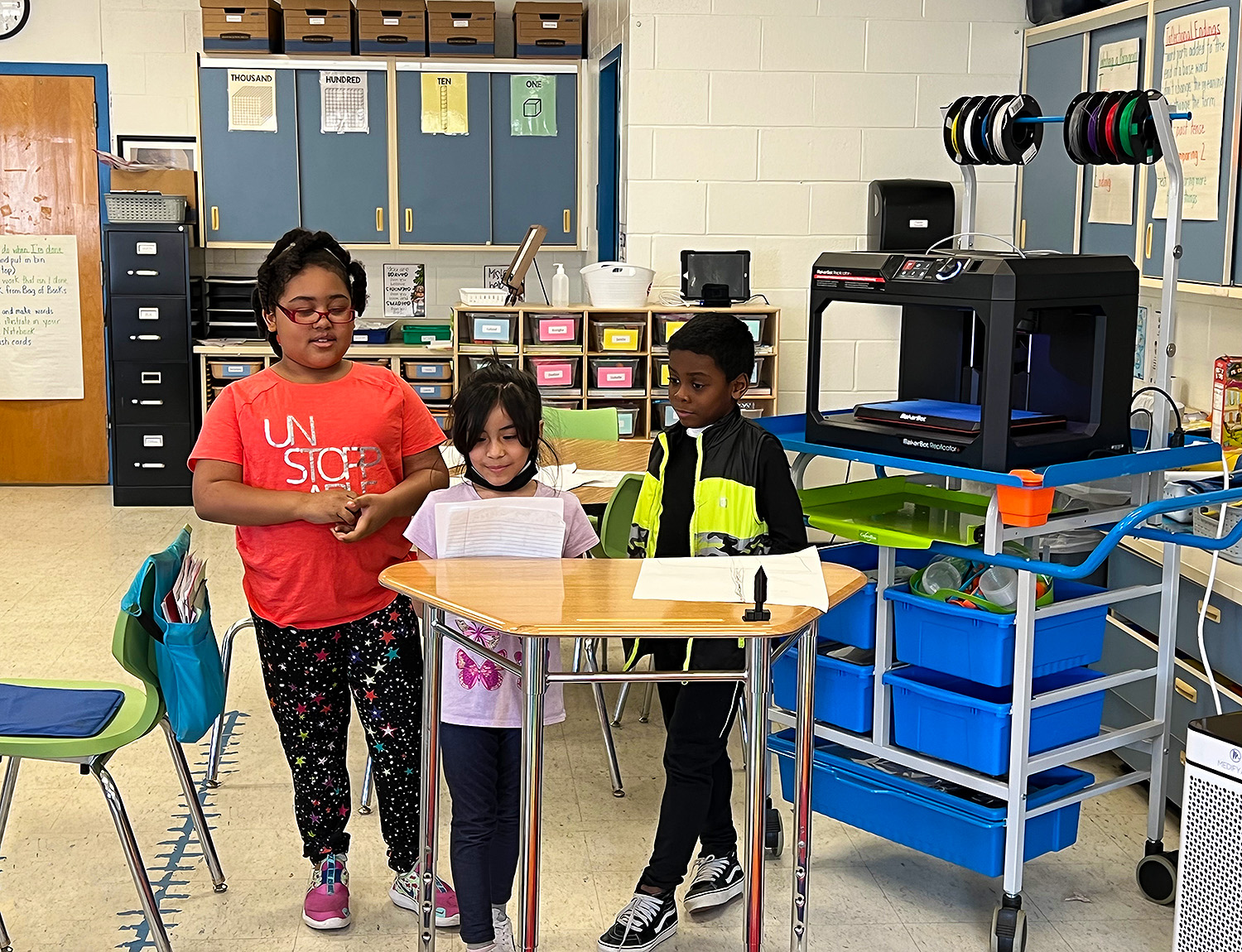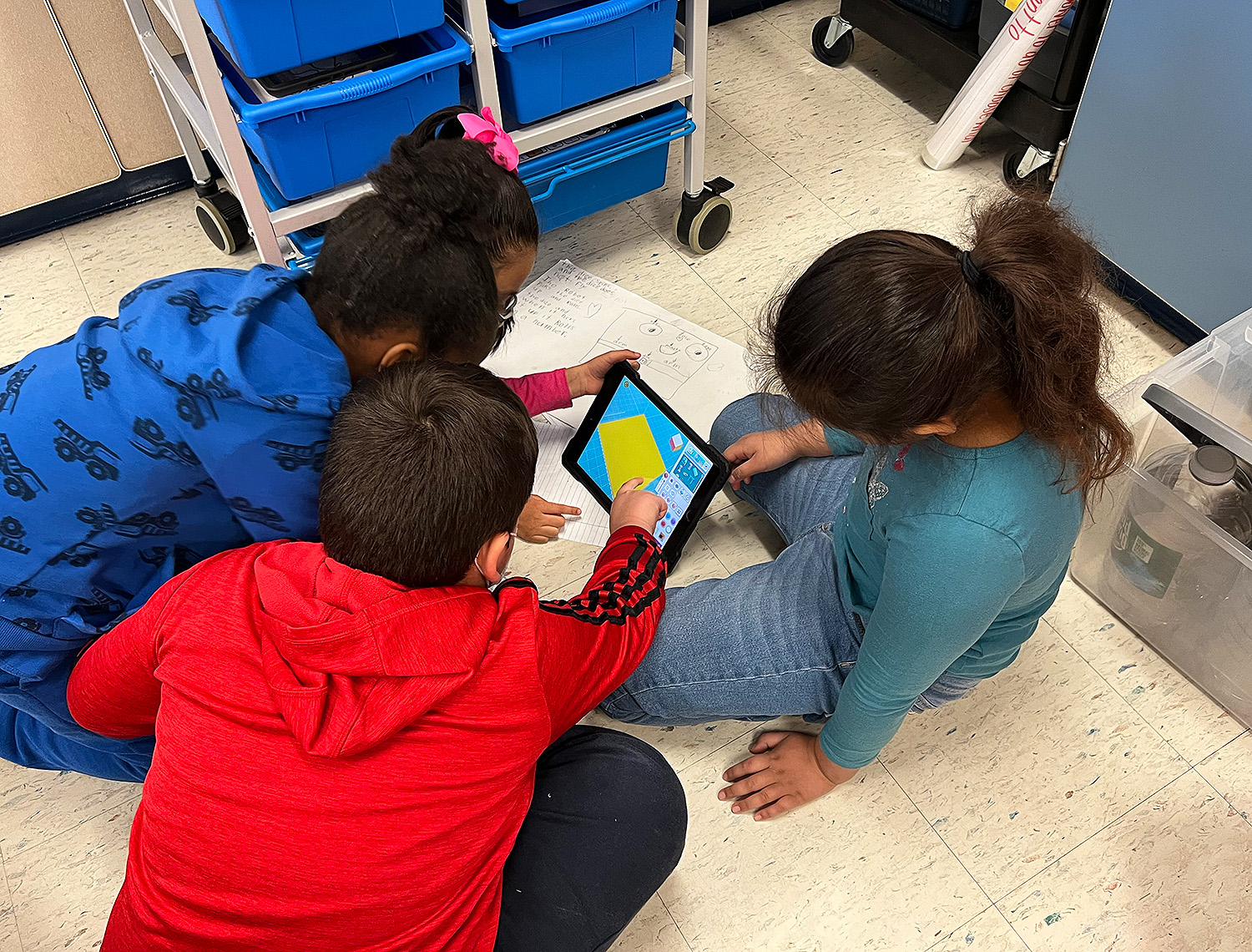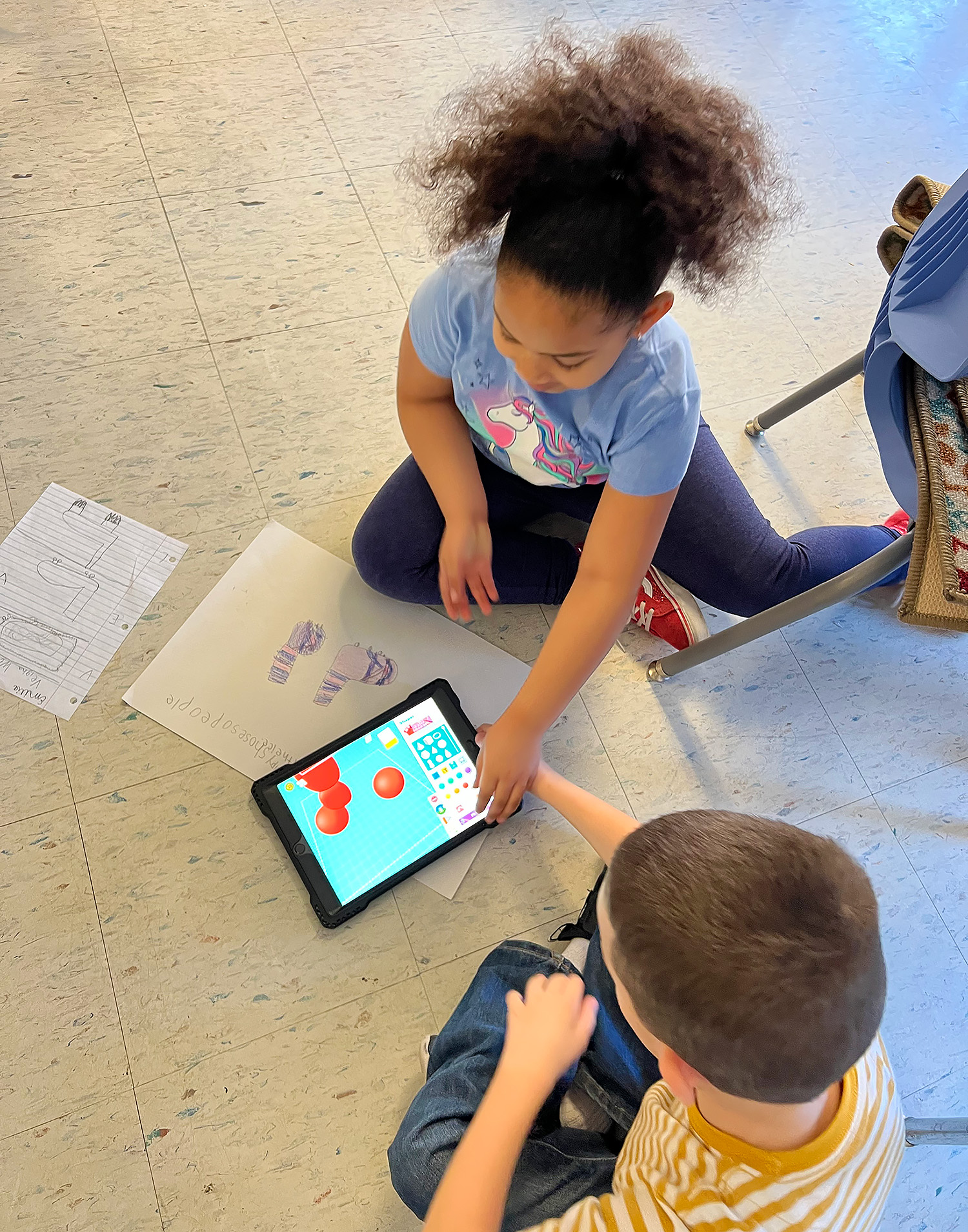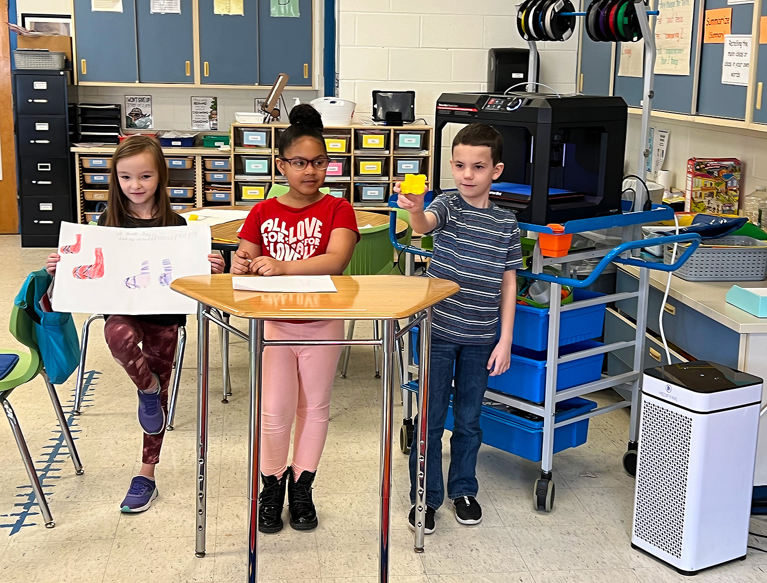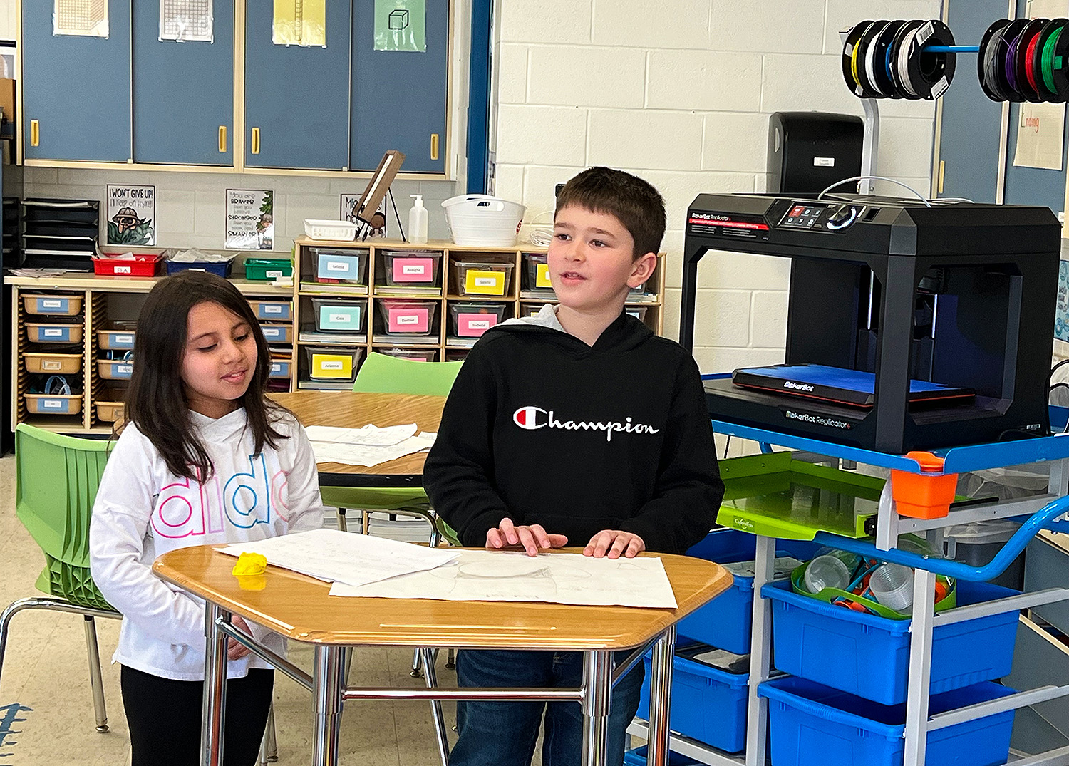 There are some engineers in the making at Cooke Elementary! Students in Mrs. Ruston’s 2nd grade class read about Rosie the Riveter and then became engineers themselves, working in groups to solve a world problem. Students decided to create cup holders that make cups less loud when they hit the floor, as well as grippy shoes that prevent individuals from slipping on ice. Students first drew scales out on paper and then used their iPads to design 3D models of their cup holders and grippy shoes using “Makers Empire the App”.