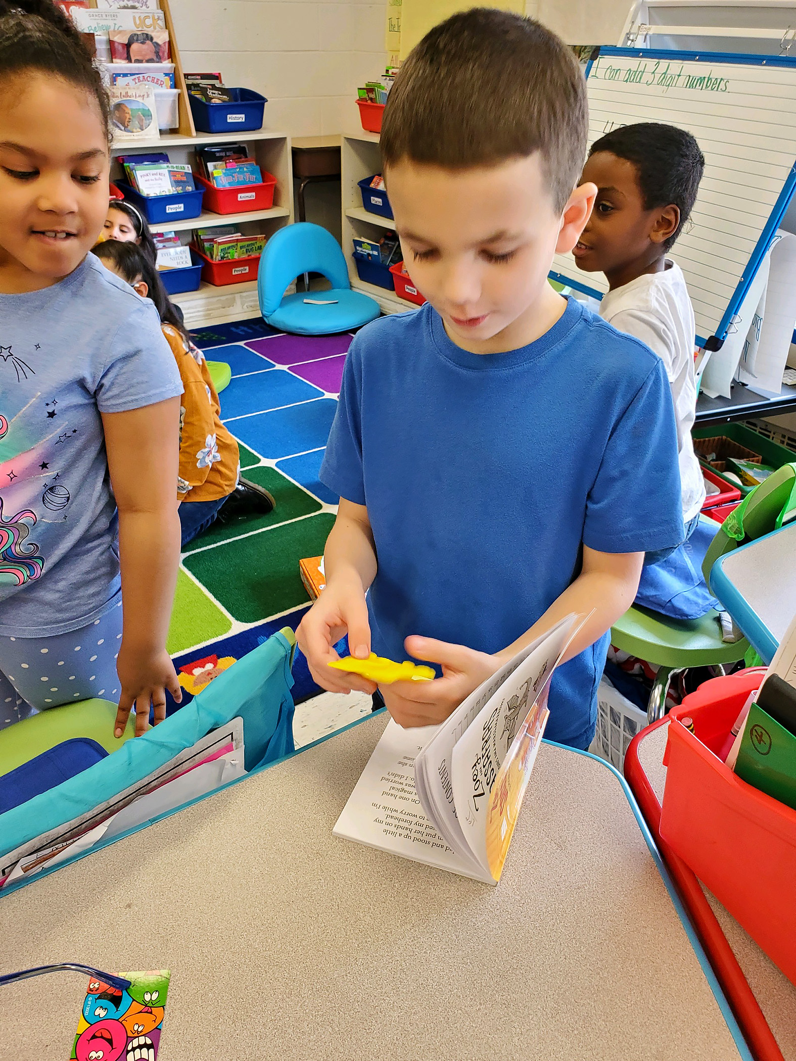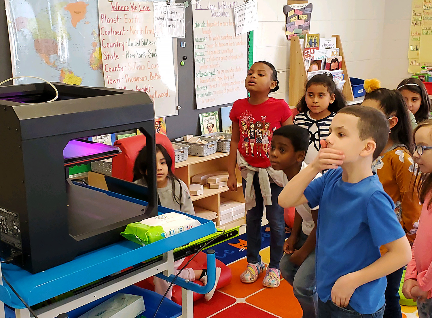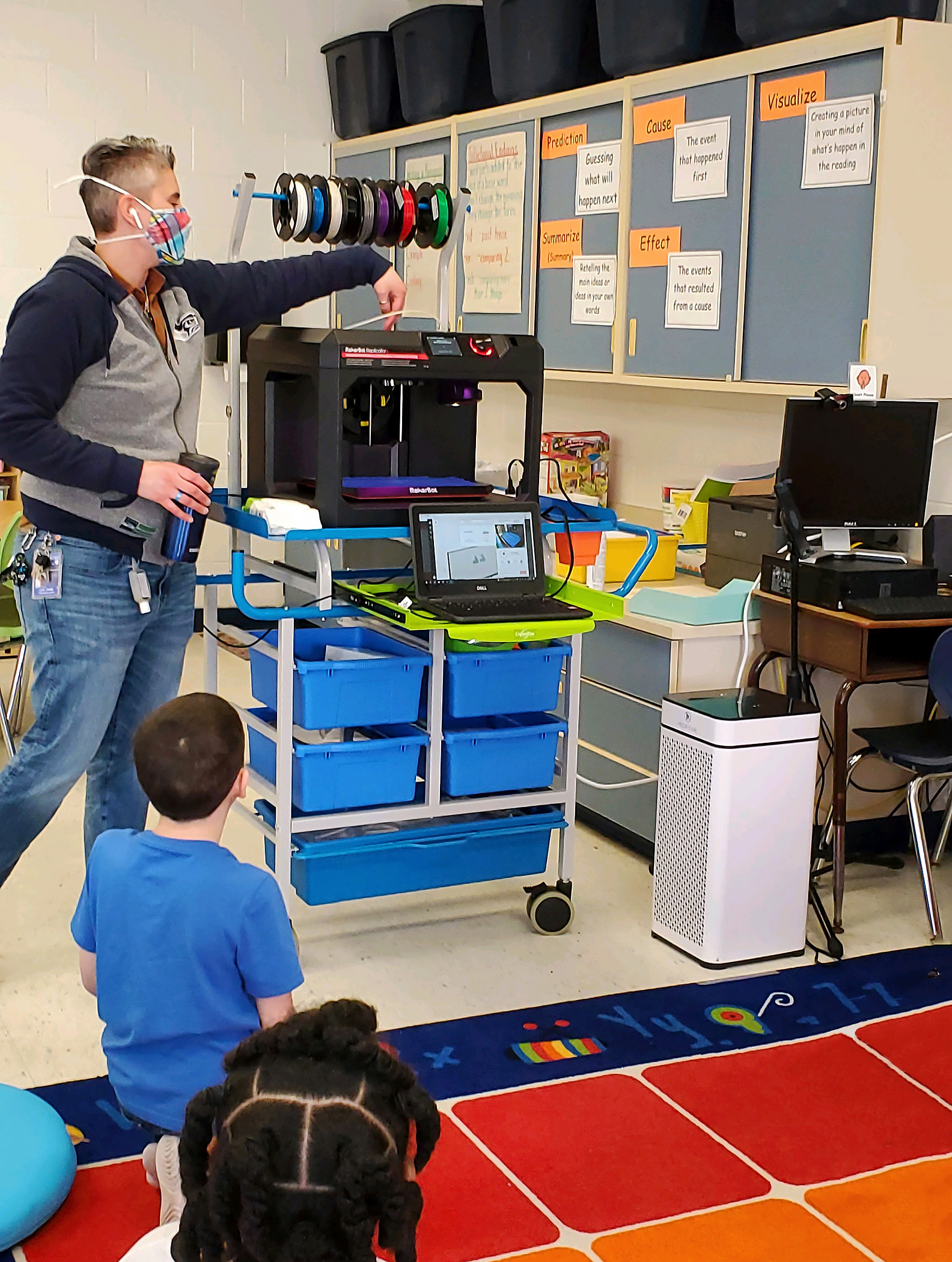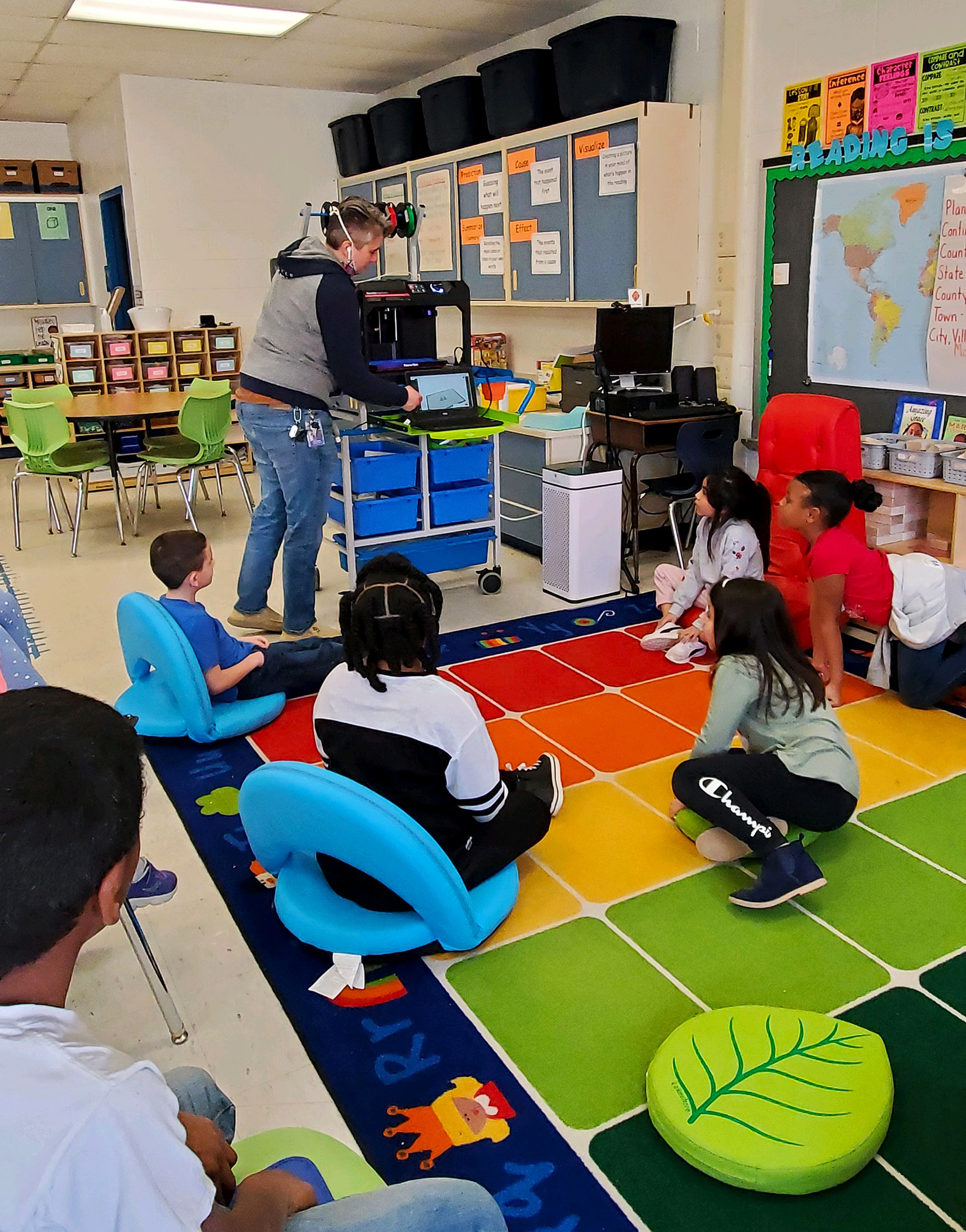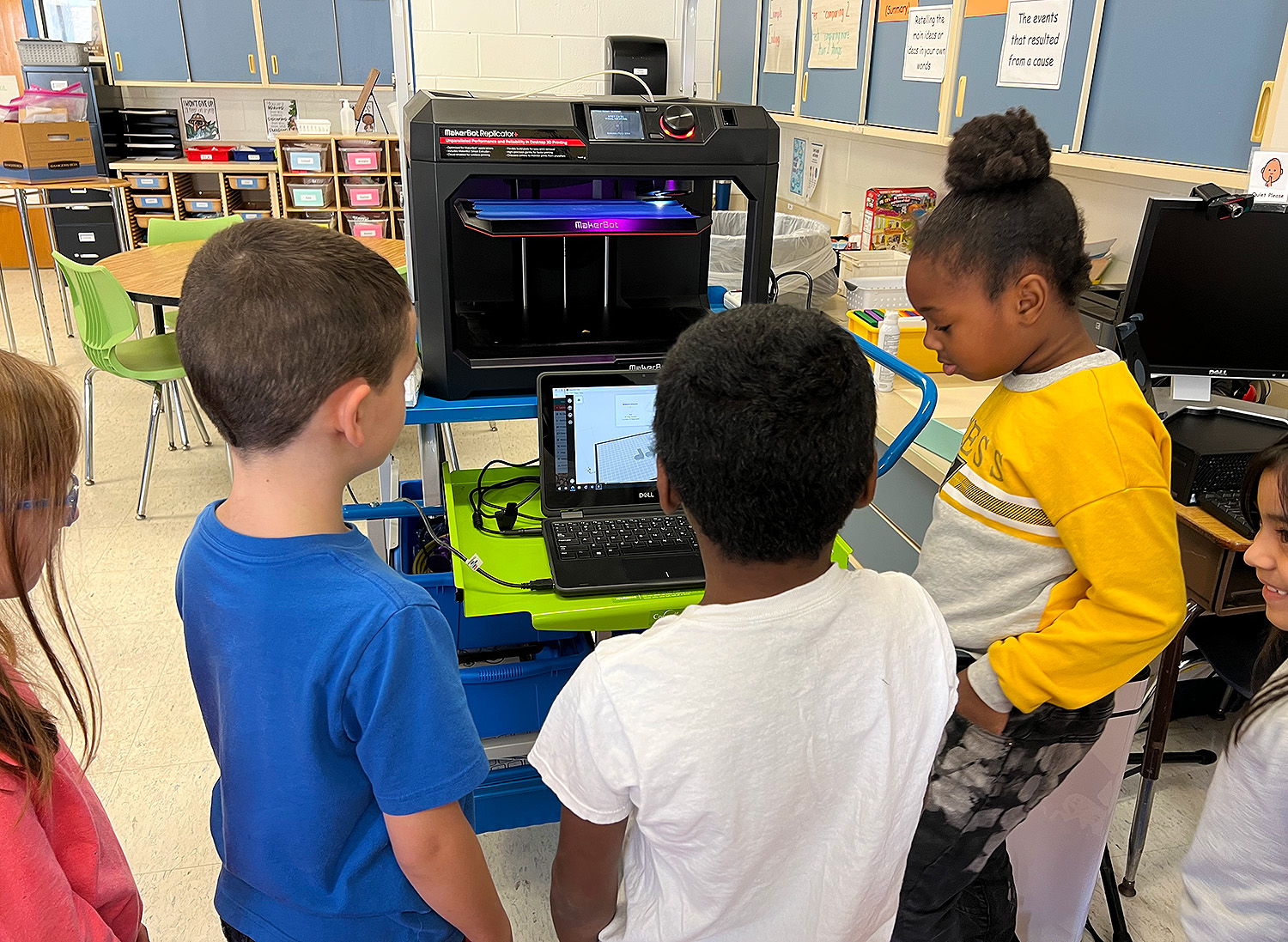 There are some engineers in the making at Cooke Elementary! Students in Mrs. Ruston’s 2nd grade class read about Rosie the Riveter and then became engineers themselves, working in groups to solve a world problem. Students decided to create cup holders that make cups less loud when they hit the floor, as well as grippy shoes that prevent individuals from slipping on ice. Students first drew scales out on paper and then used their iPads to design 3D models of their cup holders and grippy shoes using “Makers Empire the App”.