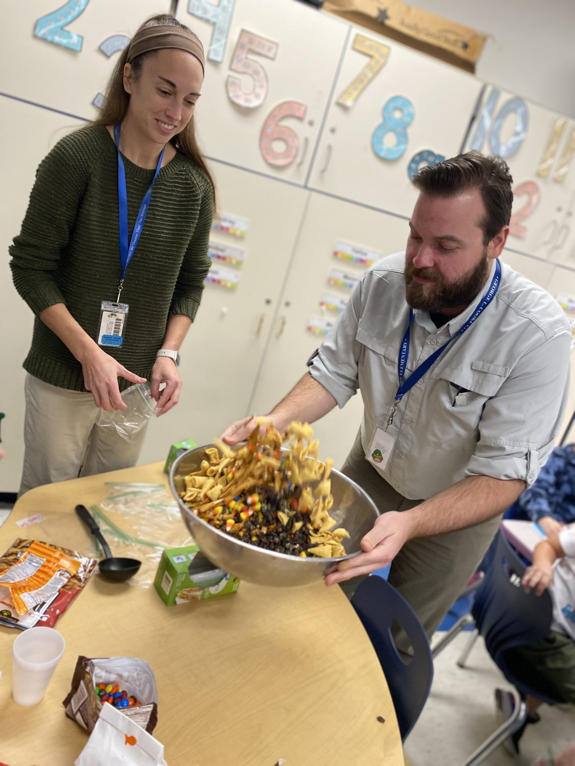 Meanwhile, in the other second-grade classrooms—Mrs. Mabee, Mrs. Rutledge, Ms. Brun, and Ms. O’Neill—the celebration continued with a fun snack mix activity! Each student added a special ingredient to a large bowl, which was expertly tossed by the talented Mr. Wilbur. The mix was then bagged for every student to take home and enjoy.