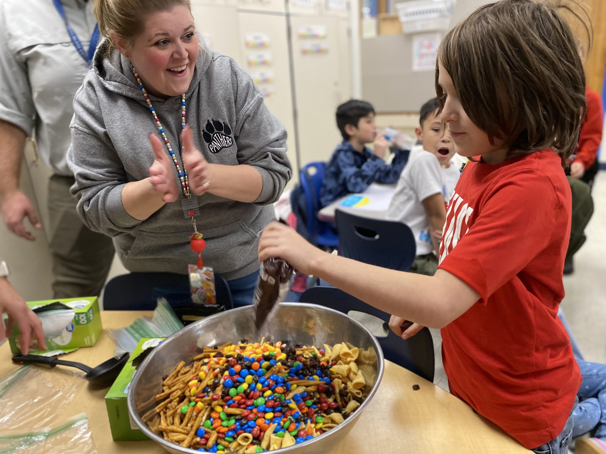 Meanwhile, in the other second-grade classrooms—Mrs. Mabee, Mrs. Rutledge, Ms. Brun, and Ms. O’Neill—the celebration continued with a fun snack mix activity! Each student added a special ingredient to a large bowl, which was expertly tossed by the talented Mr. Wilbur. The mix was then bagged for every student to take home and enjoy.